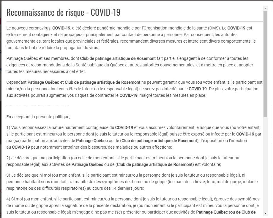 Étape #10 À ce niveau, une fenêtre apparaîtra, afin de vous demander d'accepter la politique de "Reconnaissance de risque - COVID-19". L'acceptation de cette politique est obligatoire et doit être acceptée pour tous les patineurs qui participeront à nos activités pour la saison 2021-2022. Cette politique est émise par Patinage Canada et l'enregistrement de nos membres à Patinage Canada est conditionnelle à l'acceptation de cette politique . |
